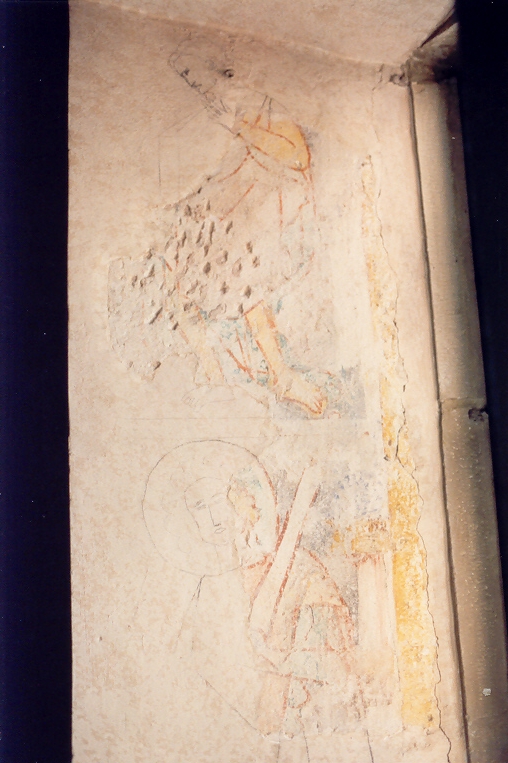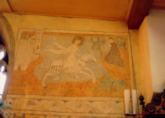 Nordwand. Hier aus dem 14. Jahrhundert ein heiliger Christophorus, von dem angenommen wird, daß es sich um einen mißverstandenen Abraham handelt. Es folgen sitzende Propheten mit heute leeren Schriftbändern. Anschließend eine Reiterszene im Wald. Wohl ein Teil der Parabel vom barmherzigen Samariter, wie er unter die Räuber fällt.
