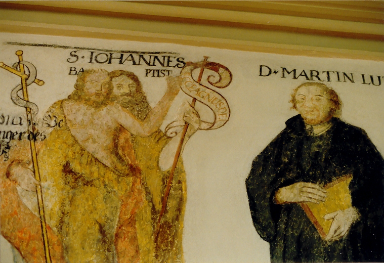 Am Chorbogen rechts und an der anschließenden Langhauswand sind aus der Spätgotik in Rechteckrahmen die Taufe Christi und St. Martin erhalten.