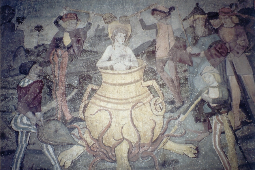 1966 wurde der heilige Sebastian aufgedeckt. Er ist etwas jünger als der Totentanz, aber auch noch aus dem 15. Jahrhundert. Sein Bild mit den Soldaten, die mit Armbrüsten auf den an einen Baum gefesselten schießen, ist an die innere Ostwand in der Völkerskapelle gemalt.