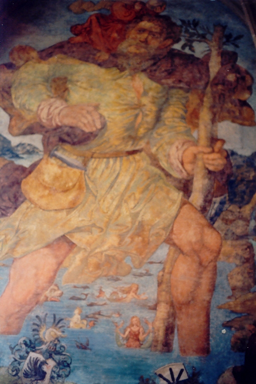 Auf der Südostwand des Chores ist ein riesiger, ursprünglich mittelalterlicher Christophorus gemalt. Bei Restaurierungsarbeiten im Jahre 1886 durch Prof. Kolb und, laut Dehio/Piel, im Jahre 1932, wurde er stark übermalt. Man kann nur annehmen, daß der heilige Christophorus auch ursprünglich sehr groß war und das Stifterpaar schon immer zu seinen Füßen kniete. Das segnende Christkind sitzt mit einem „Reichsapfel“ auf seiner Schulter. Amüsant sind die Seejungfrauen und Fische im Flußwasser.