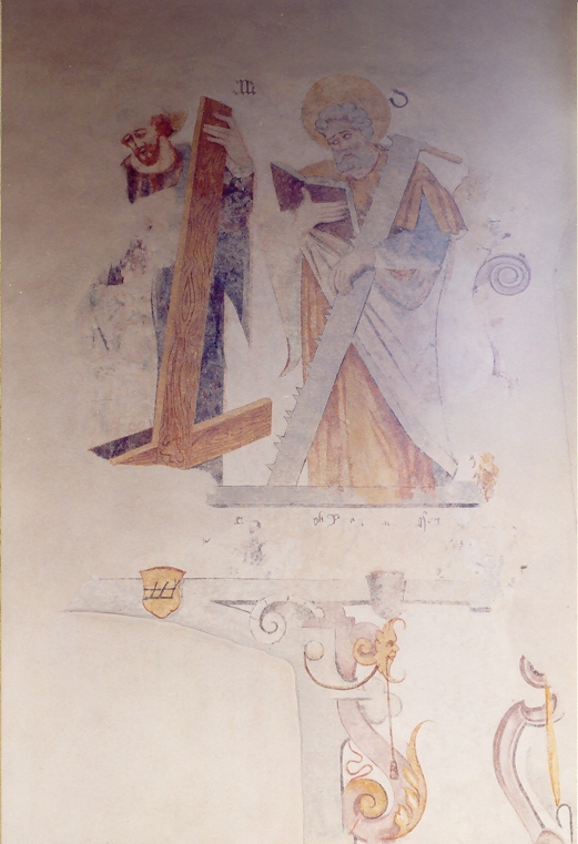 Auf der Südwand wurde im späten 16. Jahrhundert eine große Kreuzigung geschaffen. Unter dem Gekreuzigten stehen Maria und Johannes. Weiter folgt eine Schutzmantelmadonna, umrahmt von Arkantusblättern auf grünem Grund.