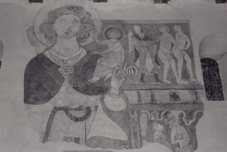Auf der dem Schiff zugewandten Chorwand ist ein älteres umrahmtes Bild freigelegt worden: Eine reichgekleidete Frau spricht mit einem liegenden Greis. Hinter ihr steht eine weitere Person und zwei kleine Engel.