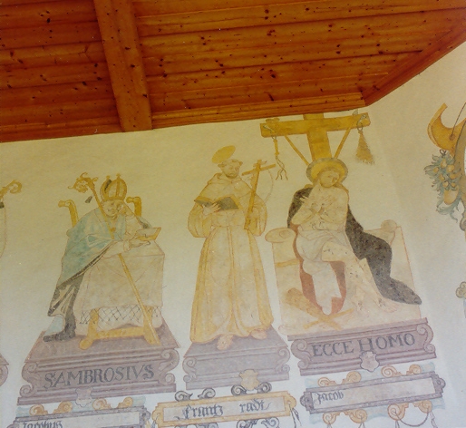 Chor: Auf der Nordwand der heilige Martin zu Pferde, die Heiligen Augustinus, Ambrosius und Franziskus, Ecce homo, zuletzt Christus sitzend mit den Leidenswerkzeugen.