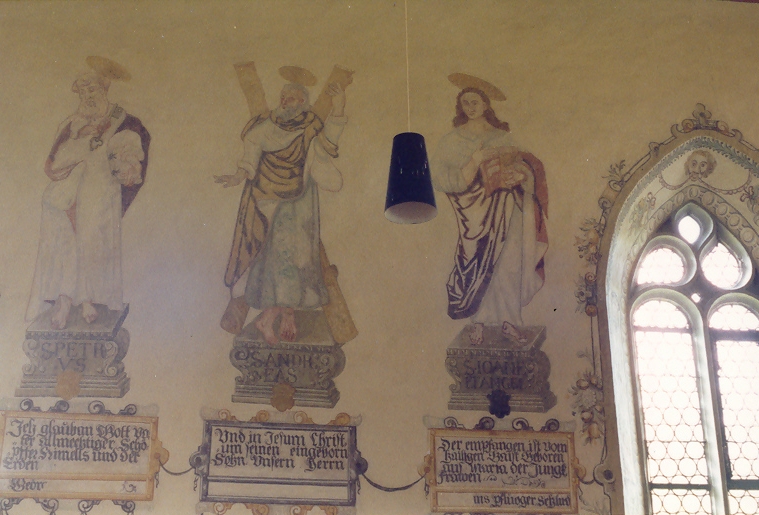 Die Heiligen sind auf Podeste gemalt, auf denen sich das Glaubensbekenntnis von Bild zu Bild fortsetzt. Zum Teil stehen auch die Namen von Stiftern dabei.