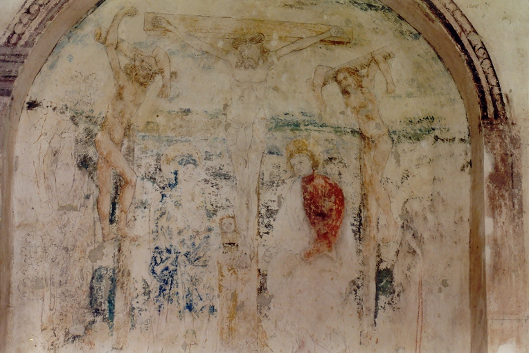 Schiffsnordwand: Wie auch auf der Südwand sind hier Bilder aus der Leidensgeschichte Christi wiedergegeben. Ursprünglich waren drei Streifen übereinander gemalt (dreimal acht Bilder). Aufgedeckt wurden nur drei und zwei halbe Bilder. Unten: die Frauen am Grab, Mitte: Pieta und Grablegung. Nochmals darunter: Das Haupt Christi und der heilige Thomas(?).
