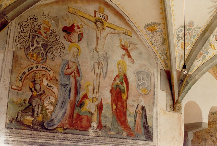 Chorbogen. Obere Hälfte: Jüngstes Gericht. Über dem Scheitel segnende Halbfigur Christi. Zu seinen Seiten blasen schwebende Engel zum Jüngsten Gericht. Auf Wolkenbänken knien bittend Maria und Johannes der Evangelist, sowie die Apostel. Darunter sind links Auferstehende, der Erzengel Michael und Petrus zu sehen. Rechts ist der aufgesperrte Höllenrachen mit Teufeln und Verdammten dargestellt. Weiter sind links und rechts des Chorbogens je eine kniende Stifterfigur gemalt.