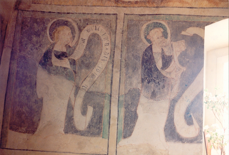 Die Gemälde sind im 15. Jahrhundert entstanden. Sie zeigen die zwölf Apostel und die heilige Margaretha. Ihre Namen stehen neben ihnen an der Wand; in den Händen halten sie Credorollen in deutscher Sprache, zu ihren Füßen verläuft ein Streifen mit lateinischer Inschrift. Am Triumphbogen ist der Verkündigungsengel und ihm gegenüber die Jungfrau wiedergegeben. Im Scheitel ist Gottvater zu sehen. Auf der Chorseite des Triumphbogens, ebenfalls im Scheitel, ist Christus als Schmerzensmann dargestellt.