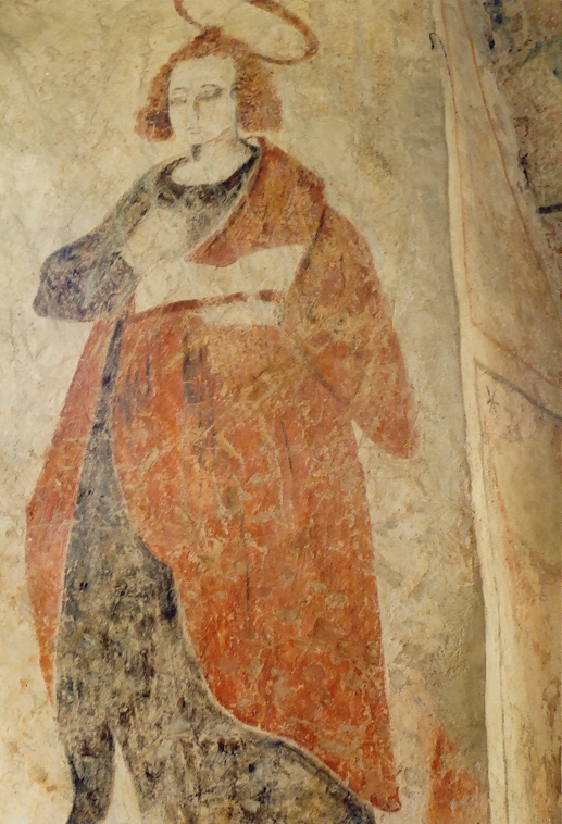 Westwand. Heiligenbilder: Der heilige Veit im großen Ölkessel stehend, der heilige Antonius Eremita und der heilige Sebastian. An der anschließenden Nordwand ist der Erzengel Michael mit Schwert und Waage wiedergegeben.