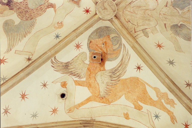 In der Zweiten Hälfte des 15. Jahrhunderts folgte die Ausmalung des Chores: Auf den Kappen des Kreuzrippengewölbes stellte man in vier umrankten Medaillons die beflügelten Evangelistensymbole dar. Schriftbänder nennen ihre Namen („Sanctus johanis“ usw.).