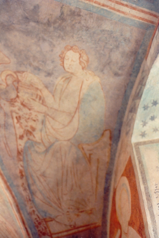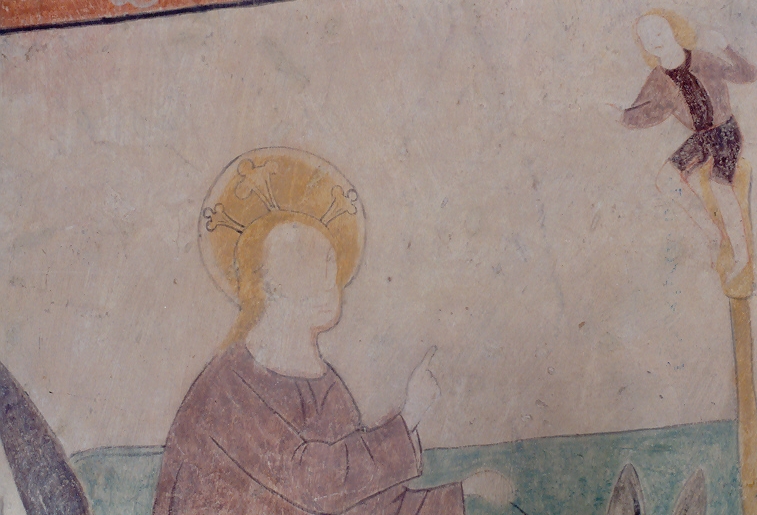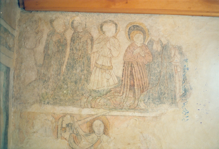 Südwand: Fragmente des Jüngsten Gerichts. Oben : Gruppe von sechs Knienden in vornehmer Kleidung. Unten: der Erzengel Michael mit dem Schwert als Richter. Links ist noch das Haupt der Muttergottes erhalten.
