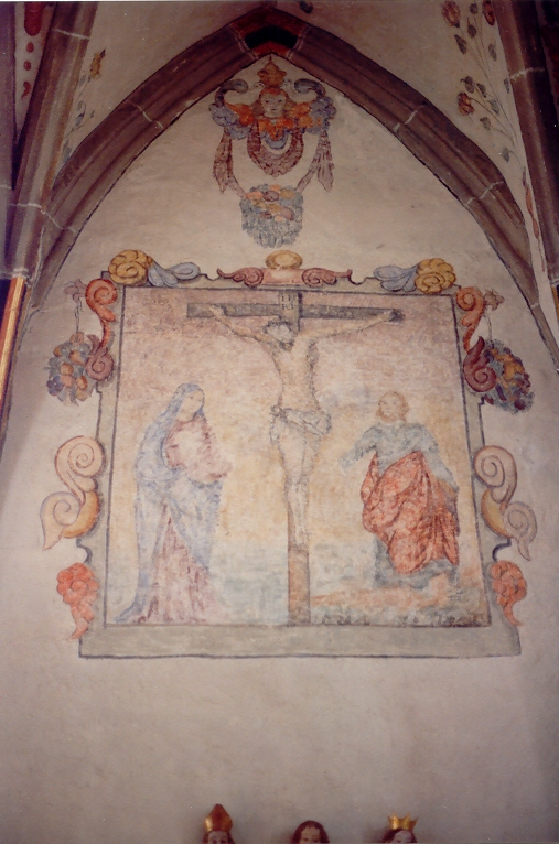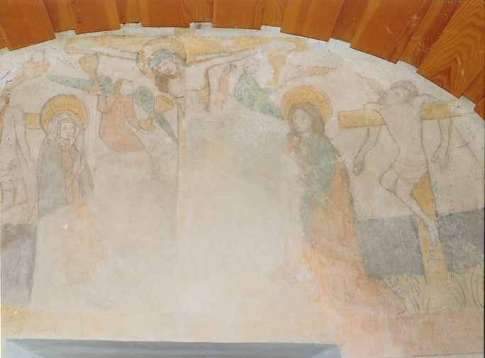 An der Nordwand des Chores wurde 1929, wohl aus dem 15. Jahrhundert, eine Kreuzigung mit Maria und Johannes dem Evangelisten aufgedeckt, ergänzt und leider auch übermalt. Außerdem ist an der gleichen Wand noch eine Person erkennbar, vielleicht ein Apostel.