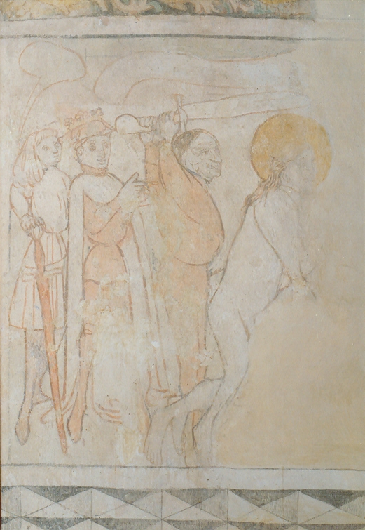 Wieder auf der Ostwand beginnend ist das Abendmahl und der Judaskuß erhalten, auf der Südwand Christus vor Pilatus und die Geiselung. An der Westwand sind die Bilder in dieser Reihe durch den Anbau des Schiffes im Jahre 1725 zerstört. Es folgt auf der Nordwand die Grablegung und die Auferstehung.