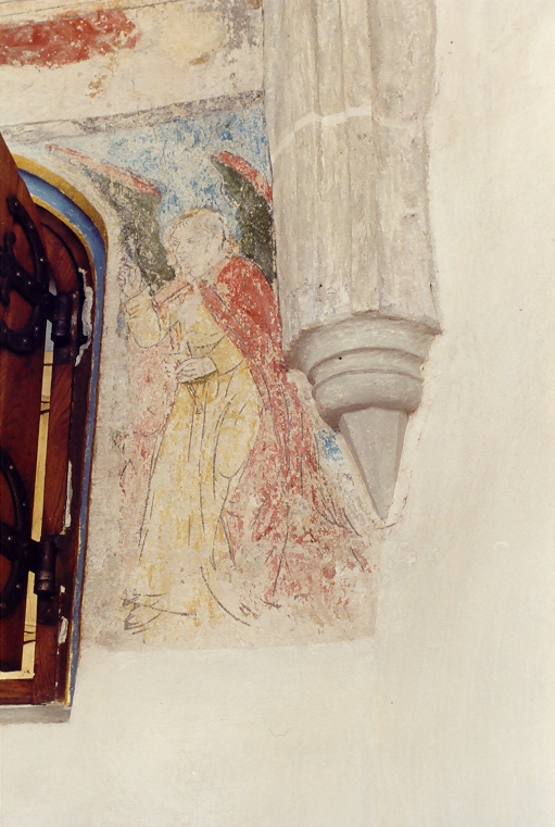 Der Gekreuzigte auf der oberen Südwand ist nur zur Hälfte sichtbar: Lendentuch und Beine fehlen; das Haupt ist tief geneigt. Sieben halbfigurige Engel fangen in Kelchen Christi Blut auf. Links ist die Muttergottes noch teilweise sichtbar, von Johannes dem Evangelisten ist noch der Kopf erhalten. Auf der Nordwand war das Abendmahl dargestellt. Hier sind noch fünf Häupter zu sehen und Fragmente von drei Jüngern. Schließlich ist auf der Nordwand eine Schutzmantelmadonna erhalten.