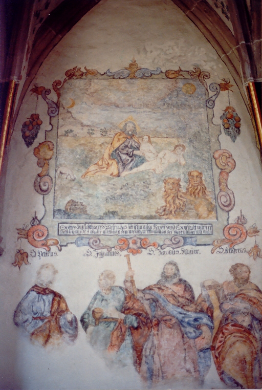 Bei umfassenden Renovierungsarbeiten im Jahre 1905 wurden vom Kunstmaler Kolb im Chor die Apostel und in der Laibung des Triumphbogens die klugen und törichten Jungfrauen aufgedeckt und renoviert. Hierbei übermalte er sie leider stark. Die Apostel stehen in Augenhöhe über dem Boden des Chores, sie sind fast lebensgroß; zu ihren Füßen sind die Sprüche des Credo vermerkt.