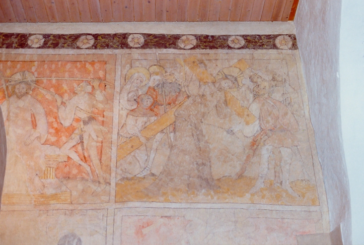 In den Jahren 1966/1967 wurden aus der Mitte des 14. Jahrhunderts im Schiff und ringsum im Chor gotische Wandmalereien freigelegt. 18 einfache Bilder bilden in zwei Reihen eine Biblia pauperum. Eine dritte, untere Reihe stellt einen gemalten Wandbehang dar. Links auf der Nordwand in der oberen Reihe beginnt mit dem Abendmahl die Erzählung der Leidens- und Auferstehungsgeschichte und setzt sich in der mittleren Reihe bis zur Himmelfahrt Christi fort. In mehr oder weniger gutem Zustand sind der Einzug in Jerusalem, das Abendmahl, die Fußwaschung, die Gefangennahme Christi und der Judaskuss, die Dornenkrönung und Kreuztragung zu erkennen. Zweite Reihe: Der Weg nach Golgatha, Kreuzaufrichtung, Kreuzigung, Kreuzabnahme und Himmelfahrt. In der Chormitte ist über dem mittleren Fenster das Schweißtuch der heiligen Veronika gemalt. Schließlich ist zur gleichen Zeit auf der Langhaus-Nordwand ein gut erhaltener, großer Christophorus mit dem Kind auf der Schulter dargestellt worden.