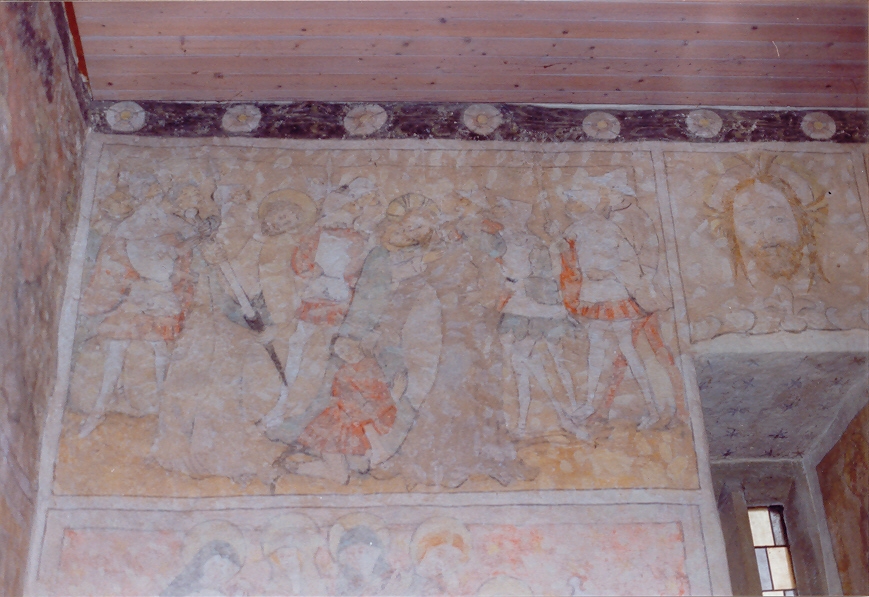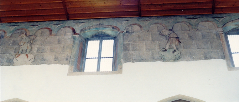 Rechts und links im Chor und am Chorbogen befinden sich, aus der Bauzeit, die ältesten Darstellungen (die Freilegungen erfolgten leider aus verschiedenen Schichten!). Sie sind von Bogenansätzen des ehemaligen Lettners, der im 15. Jahrhundert eingebaut wurde, durchschnitten. Links vom Chorbogen sind aus der Mitte des 14. Jahrhunderts die Heiligen Drei Könige freigelegt. Die Malereien zeigen weiter die heilige Anna selbdritt und Engel aus einer jüngeren Schicht. Darunter ist eine Auferstehungsdarstellung und ein Stifterbild aus der ersten Hälfte des 15. Jahrhunderts wiedergegeben. Rechts vom Chorbogen dürften zwei kniende Propheten mit Schriftbändern im späten 15. Jahrhundert gemalt worden sein. Ein Gastmahlbild über einem zugemauerten Kapellentor wurde in der zweiten Hälfte des 14. Jahrhunderts geschaffen. Links von einer jüngeren Malschicht sind in der Mitte des 15. Jahrhunderts als Fragment die trauenden Marien und ein Kriegsknecht als Teil einer Kreuzigungsszene freigelegt worden (rechts des Chorbogens). Darüber ist wieder ein Prophet abgebildet. Über einer Tür auf der Chorsüdseite kniet, rechts von einer leeren Nische aus der Zeit um 1470, ein Stifter. Links von ihr ist eine Gregoriusmesse mit der Erscheinung Christi abgebildet. Ebenfalls an der Chorsüdwand ist ein schlecht erhaltenes Abendmahl aus der Mitte des 15. Jahrhunderts zu sehen. Links davon ist, wie in St. Jodok, der Feiertagschristus abgebildet (15. Jahrhundert). Auf der rechten Seite der östlichen Chorwand wurden aus der gleichen Zeit Szenen der Leidensgeschichte freigelegt: Der kreuztragende Christus, die gefesselten Schächer und die Kreuzaufrichtung. Über dem Eingang zur Gesellschaftskapelle, auf der Chornordwand, ist eine spätmittelalterliche heilige Kümmernis gemalt. Schließlich legte man im Langhaus, aus dem späten 15. Jahrhundert über dem zweiten Pfeiler von Osten auf der Nordseite, einen kleinen gebückten Mann frei, der scheinbar den Schalldeckel der Kanzel stützt.