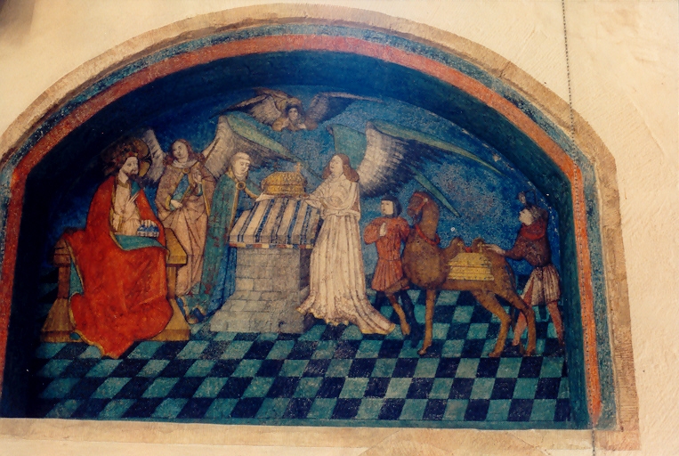 Im Altarraum wird in der unteren Reihe die Kindheit Jesu erzählt: Geburt, Anbetung der Könige, Beschneidung, Kindermord in Bethlehem, Flucht nach Ägypten und der zwölfjährige Jesus im Tempel. Das Bild über dem gotischen Fenster zeigt entweder die Heilige Dreifaltigkeit oder den Gnadenstuhl mit Maria; die Deutung ist nicht gesichert.