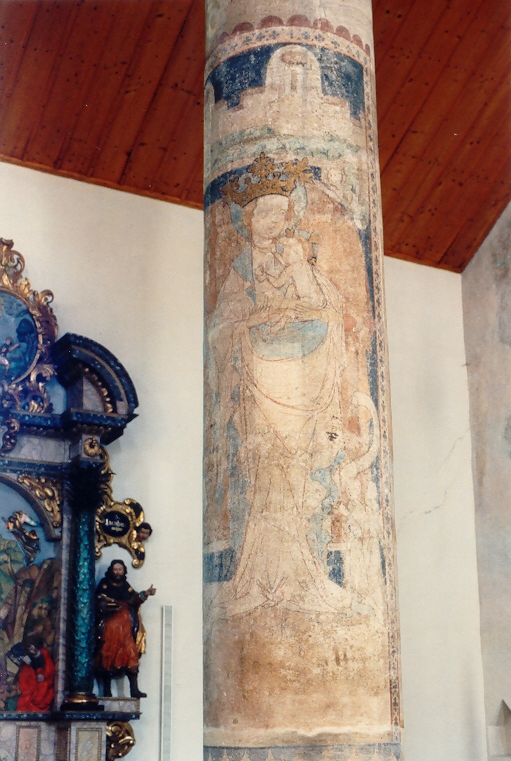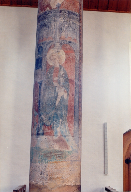 Die Bedeutung der Kirche machen ihre Wandmalereien aus, die vor allem in der Zeit von 1390 bis 1460 entstanden sind. Nicht nur ein Gemälde ist von hohem Rang, sondern mehrere. Kunstgeschichtlich am bedeutendsten ist die Bemalung von neun Rundpfeilern. Zu sehen sind hier auf der Südseite von West nach Ost auf dem ersten Pfeiler ein Schmerzensmann mit den arma Christi und der heilige Bartholomäus. Es folgen die heilige Elisabeth und der heilige Sebastian; der heilige Bernhard von Clairvaux(?) und drei Engel auf dem dritten Pfeiler. Auf dem vierten Pfeiler ist der heilige Florentius mit Stifterin und auf dem fünften Johannes der Täufer gemalt. Auf der Nordseite folgt auf dem ersten, östlichen Pfeiler eine bezaubernde Madonna mit dem Kind, sowie der heilige Stephan und zwei kleine Stifterfiguren. Nach dem Kanzelpfeiler ist auf dem siebenten Pfeiler Mariä Heimsuchung dargestellt. Es schließen sich der heilige Wolfgang und die heilige Barbara an. Schließlich auf dem letzten Pfeiler ein mächtiger, das Kind tragender Christophorus mit ausdrucksstarker Mimik (Mitte des 15. Jahrhunderts). Während der Schmerzensmann und der heilige Sebastian gegen 1400 gemalt wurden, folgten die übrigen Figuren um 1420 im weichen Stil (A. Schahl).