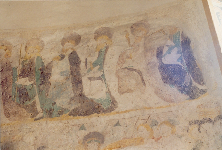 Ostwand: Stehender mit Buch, rechts drei stehende und zwei sitzende Gestalten; links vier stehende Frauen, rechts ein Mann und zwei Frauen. Nordwand: Thronender Bischof und Kardinal. Südwand: Thronende Gestalt und stehender Bischof. Darunter vielleicht Taufe Christi und Christus mit der Samariterin. Unten rechts undeutbare Reste der Malerei von 1400.
