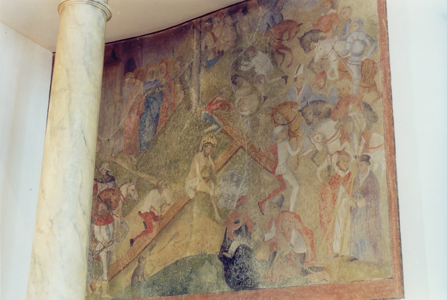 Im Gewölbe sind mit Spruchbändern die vier Evangelistensymbole erhalten. An der Westwand über dem Chorbogen ist das Abendmahl wiedergegeben, an der Nordwand im Bogenfeld die Ölbergszene, an der Ostwand die Kreuztragung und die Kreuzannagelung und an der Südwand die Kreuzigung. In der nördlichen Stichkappe sind die Kirchenväter Hieronymus, Ambrosius, Augustinus und Papst Gregor der Große abgebildet, in der östlichen Stichkappe die Krönung Marias. Im Bogenfeld der Südwand ist aus der Verkündigung nur noch die Umrißzeichnung des Engels Gabriel gut erhalten.