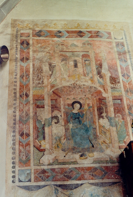 In der Chorbogenlaibung sind die fünf klugen und die fünf törichten Jungfrauen gemalt. Wohl beim Umbau im Jahre 1477 wurden die Quadersteine des Chorbogens in einer falschen Reihenfolge zusammengesetzt, so daß man den Eindruck eines Rätselspiels hat.