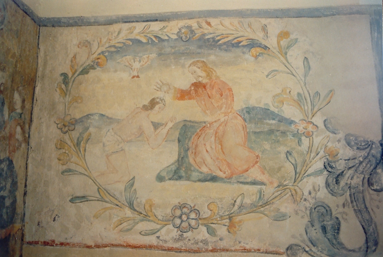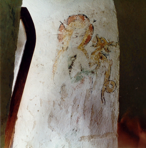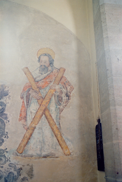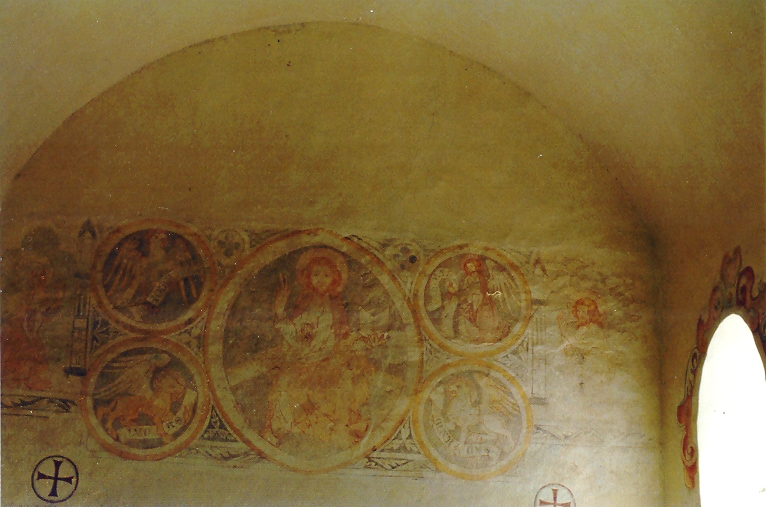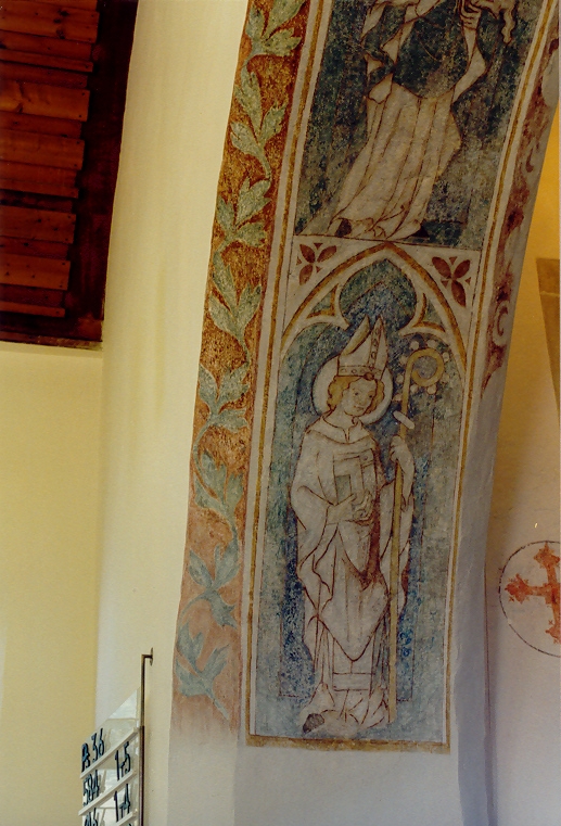 II) Erstes Viertel des 14. Jahrhunderts, Chorgewölbe: Christus in der Mandorla auf dem Regenbogen sitzend. Seitlich in vier Kreisen die Evangelistensymbole. An der Chorostwand in den Laibungen der romanischen Fenster Spuren von Malerei: Das Haupt Christi und eine Märtyrerin. Im Schiff sind an der Nordwand in den Zwickeln der Bögen Prophetenbüsten gemalt. An der Südwand ein Bilderzyklus aus dem Leben Christi: Verkündigung, Heimsuchung, Geburt Christi, Hirten, Anbetung der Könige, Flucht nach Ägypten, der Zwölfjährige im Tempel, Hochzeit von Kanaan, Taufe Christi. In der Laibung des alten Fensters an der Südwand die Versuchung Christi. In den Zwickeln die Brustbilder von Engeln. Nach Westen anschließend ein stehender König. Nach einem Fenster folgt ein heiliger Christophorus, St. Martin mit seinem Mantel, St. Michael mit der Waage und das Martyrium eines Heiligen.