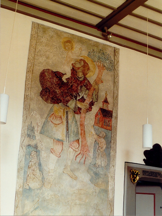 1962 legte man anläßlich von Renovierungsarbeiten auf der nördlichen Seitenwand einen nahezu über die ganze Höhe der Wand gehenden Christophorus frei: Das mit der Linken segnende Christkind sitzt auf der rechten Schulter des Heiligen. Rechts von diesem sind ein sitzender Stifter und eine kleine Kirche gemalt; links ein kniender Stifter und ein Schriftband.